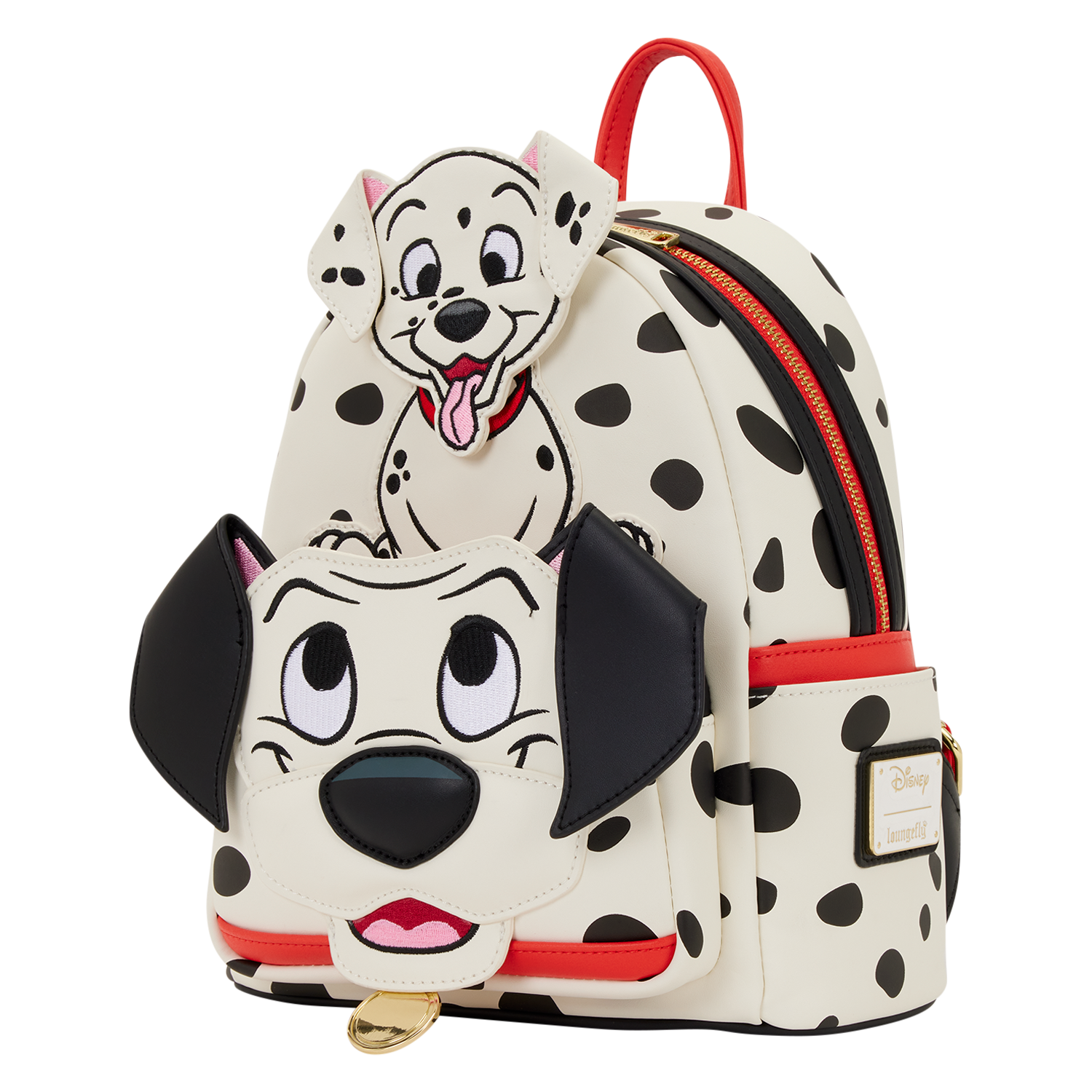 This bag is inspired by Disney’s 101 Dalmatians. On the front, you’ll find Pongo with Freckles sitting on his head! The puppy’s head tilts side to side. You’ll find black spots all over the bag! A molded metal charm of Pongo’s collar hangs from the bottom. All over the straps, you’ll find a debossed pattern of puppy prints!