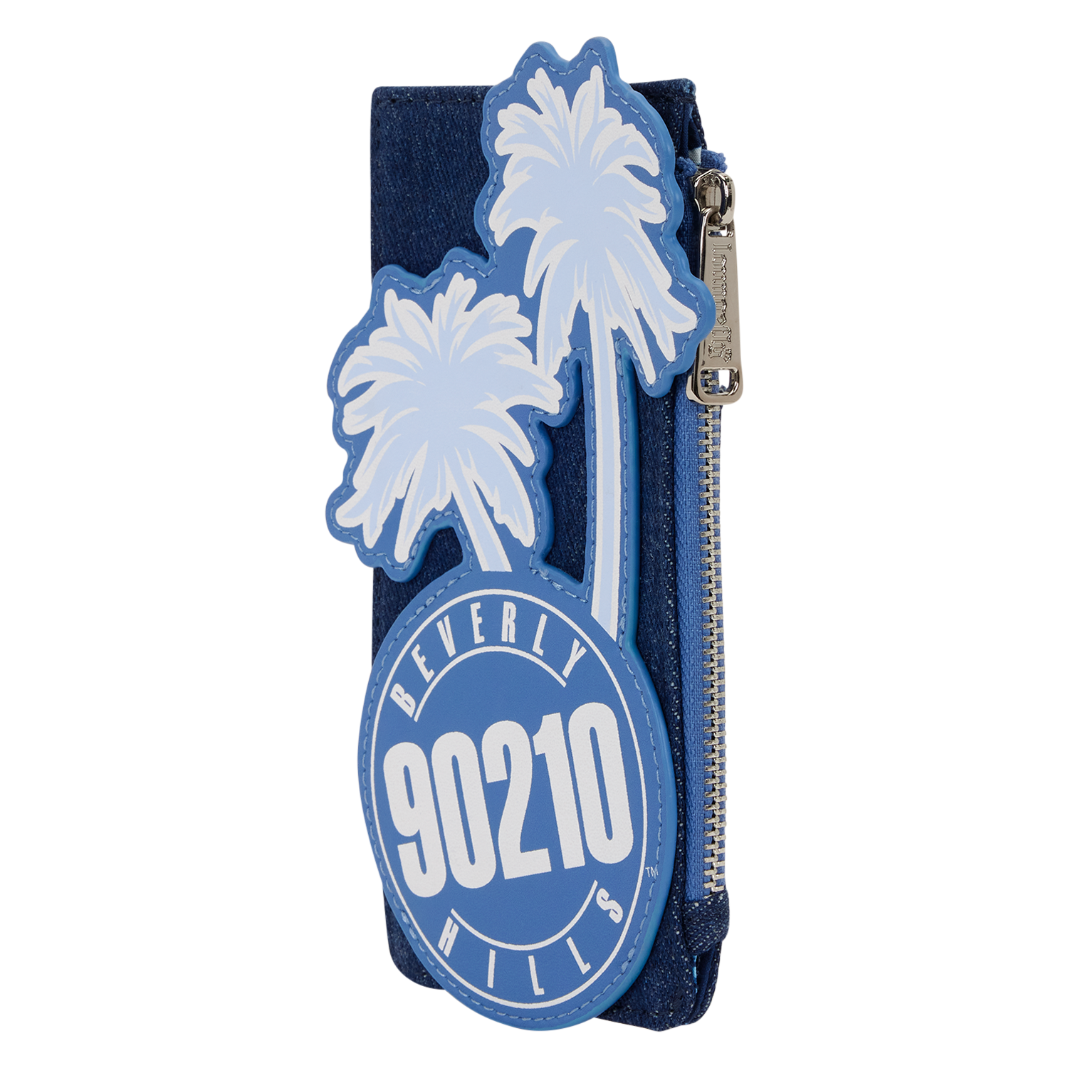 You’ll find a pair of palm trees behind a circular applique that says “90210” and “Beverly Hills.” Turn it around to find four white-and-blue card slots!