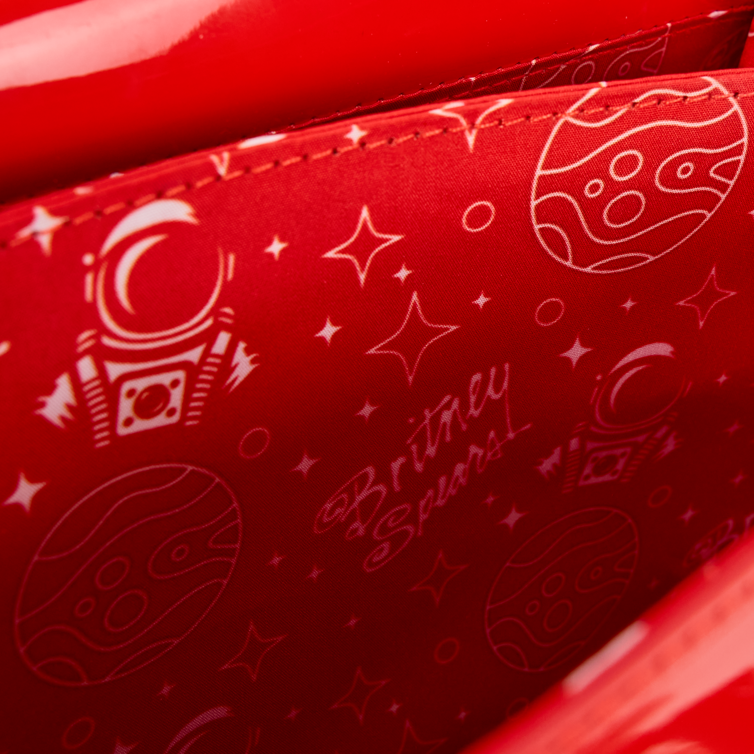 This crossbody bag pays homage to her music video for “Oops!…I Did It Again.” It’s bright red patent faux leather, and you’ll find a silver-colored metal charm of Britney’s silhouette on the front. On the back, you’ll find “Oops! I Did It Again” written in silver foil.