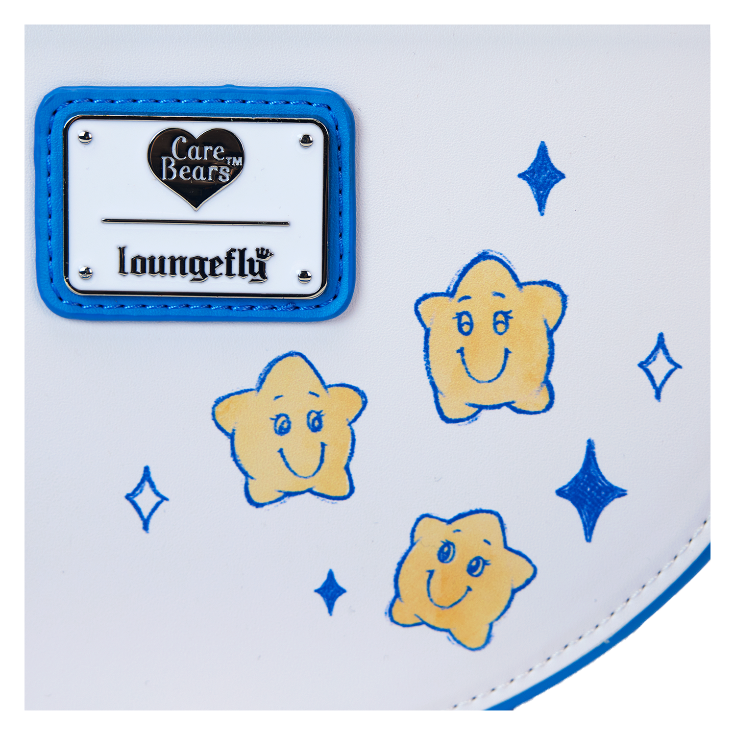 Prepare to stare! This Care Bears crossbody bag is carefully designed to bring so much joy. The front flap of this half-moon style bag features an applique of Cheer Bear standing on the shoulders of Grumpy Bear, and they’re surrounded by other Care Bears who are playing among the clouds. Lift the flap, and you’ll find colorful print hearts. The handle is a padded applique in the shape and colors of a rainbow! Two applique clouds appear below, and a detachable vegan leather charm of a smiling sun tops off the look. Pack just what you need for the day to gather your friends and spread kindness wherever you go.