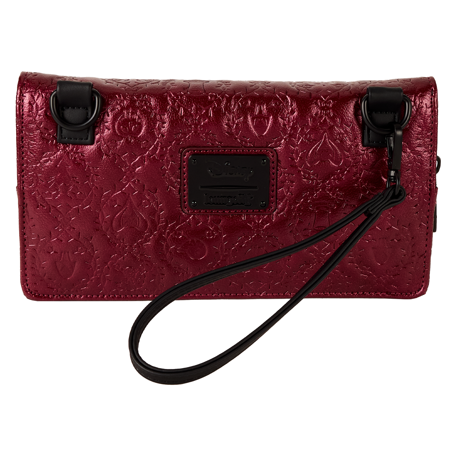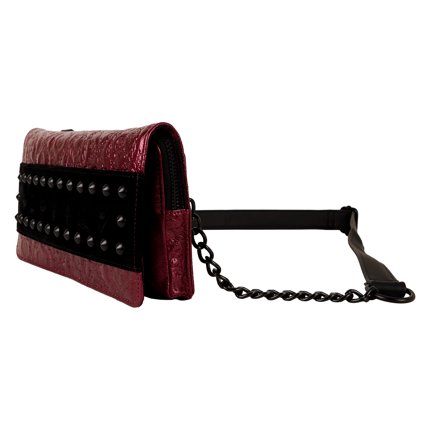 Find debossed symbols of popular Disney Villains within spiky thorns all over the bag. Stud cones and velvet bring the whole look together. This style is versatile: you can carry it as a clutch by using the wristlet strap or attach the crossbody strap to wear it like a purse!