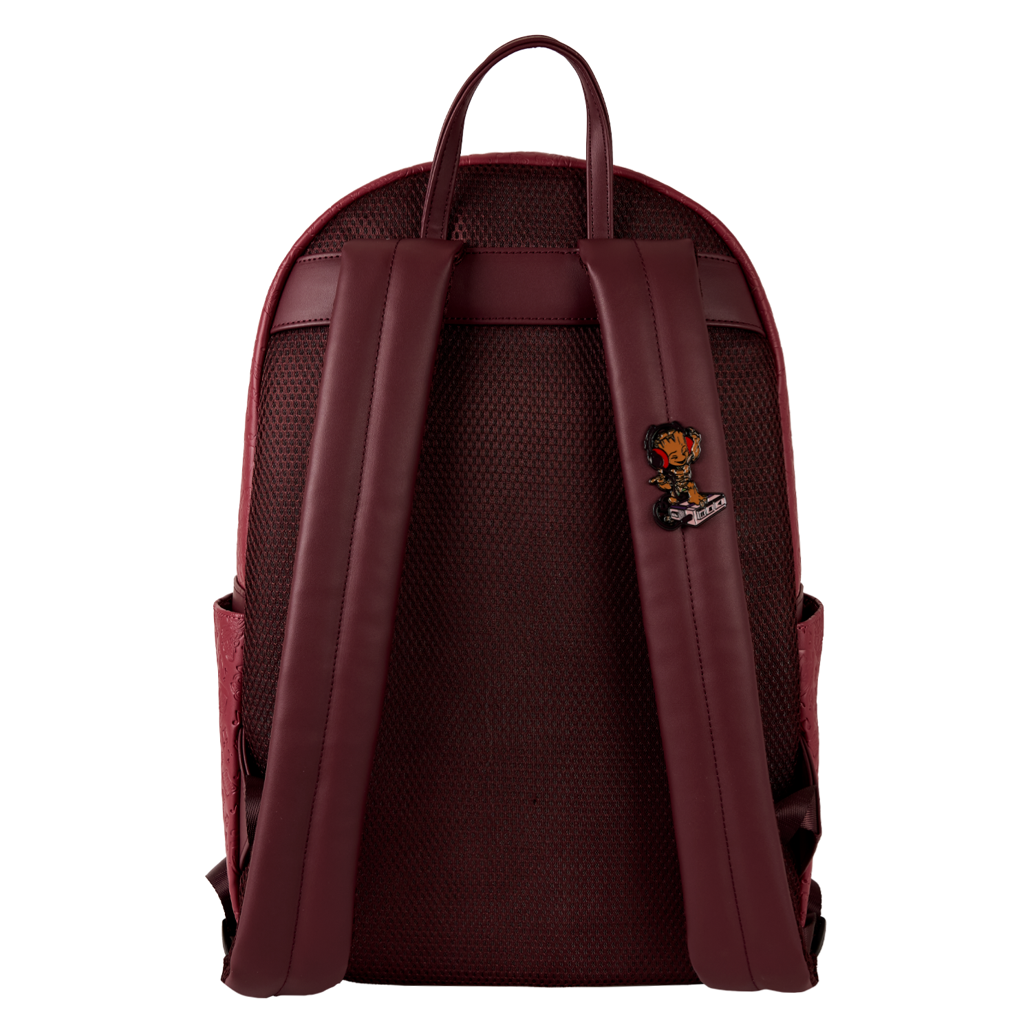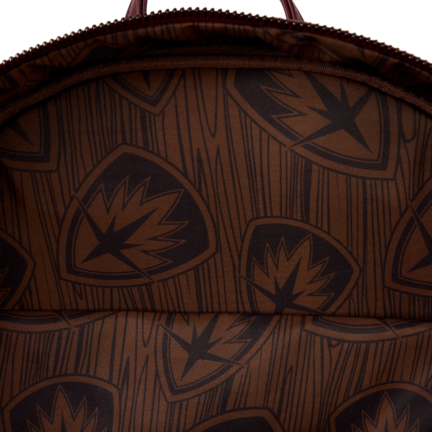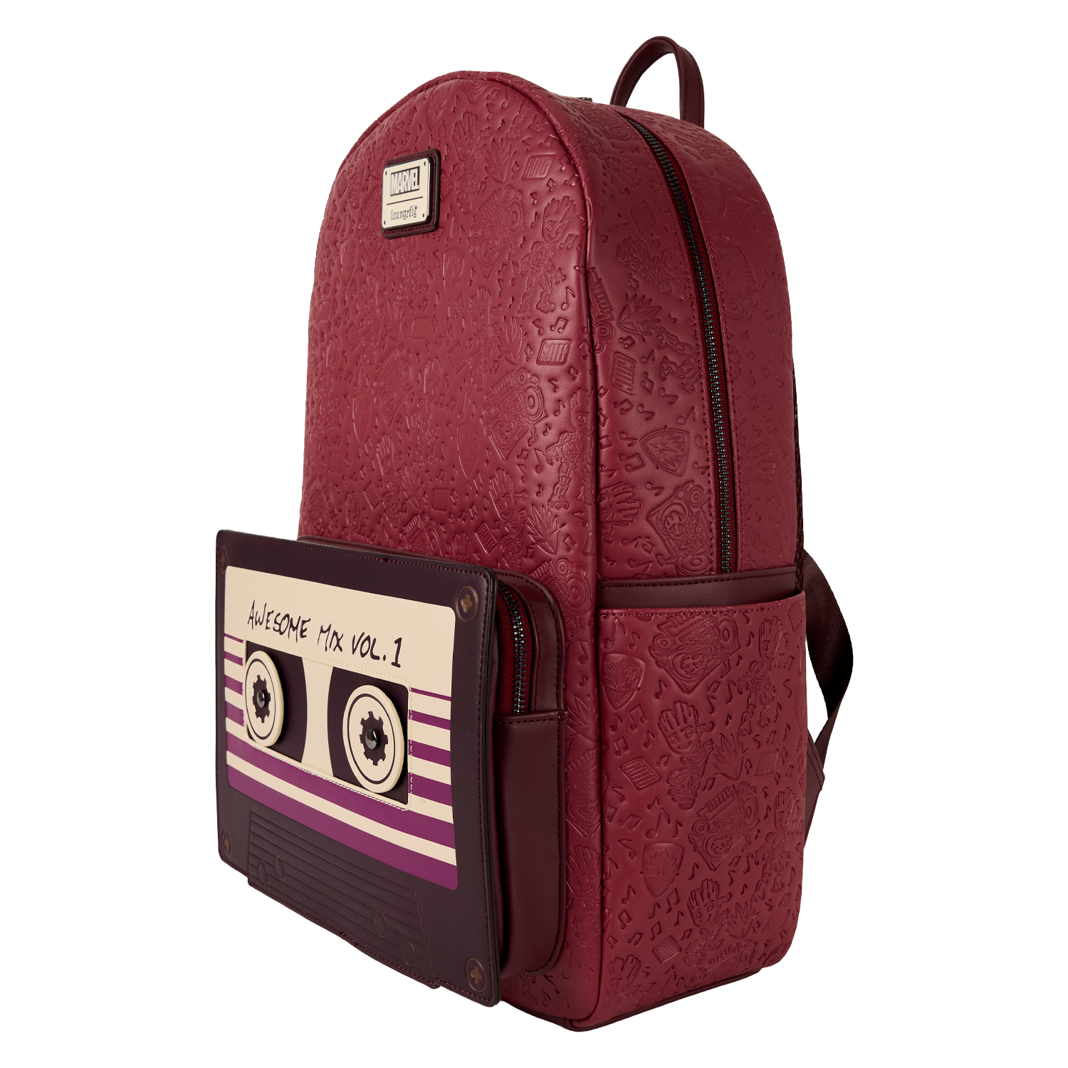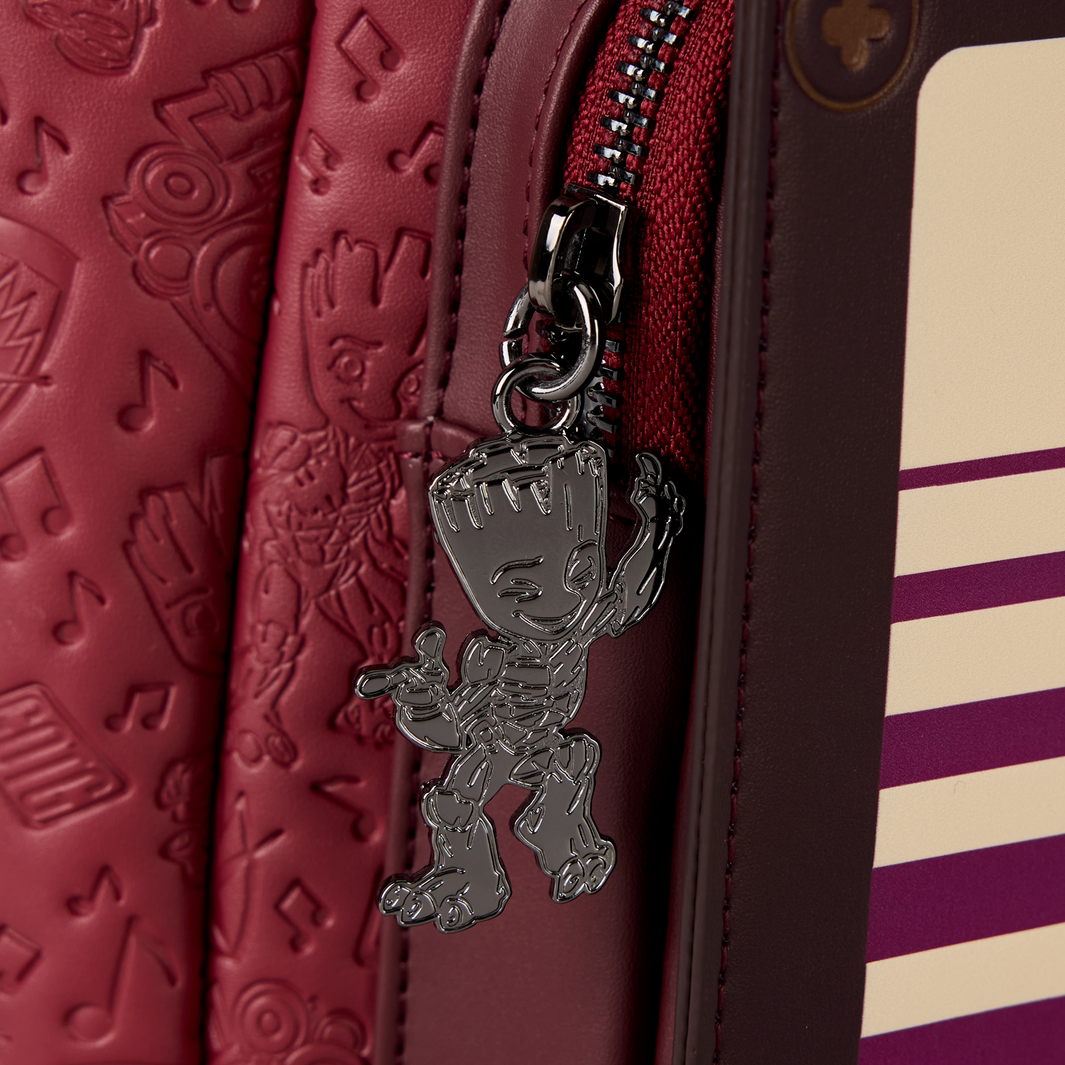 This backpack is inspired by Groot from Marvel’s Guardians of the Galaxy. The front pocket is in the shape of a cassette tape that’s labeled as “Awesome Mix Vol. 1.” The tape reels move on a spinning rivet! All over, you’ll find a debossed pattern of cassettes, Groot, music notes, and more! For another fun touch, you’ll find Groot on the zipper pull and an enamel pin of him on the strap!