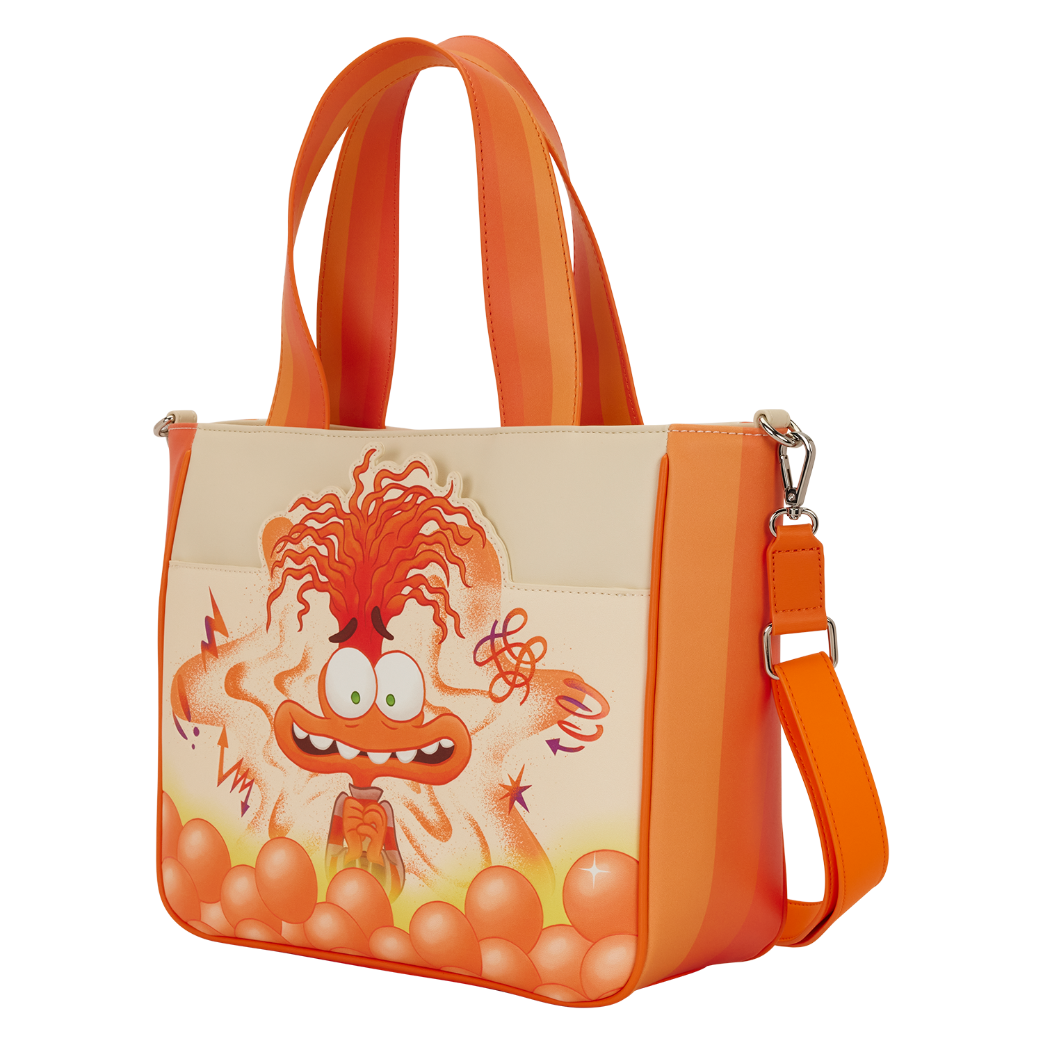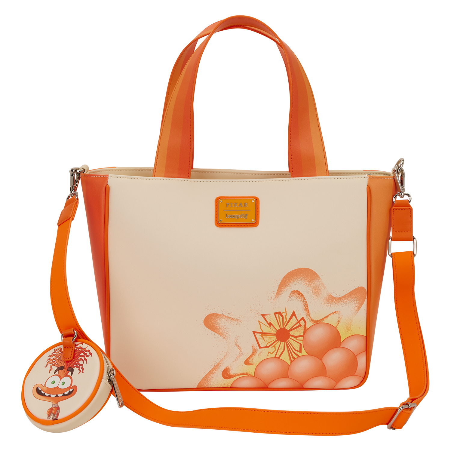 This tote bag is inspired by Anxiety from Disney and Pixar’s Inside Out 2. You’ll find her front and center on the bag, surrounded by orange memory spheres. Turn it around to find more orange memory spheres and Riley’s anxious Sense of Self. Plus, there’s a coin bag attached to the strap that features Riley’s anxious Sense of Self on one side and Anxiety on the other.
