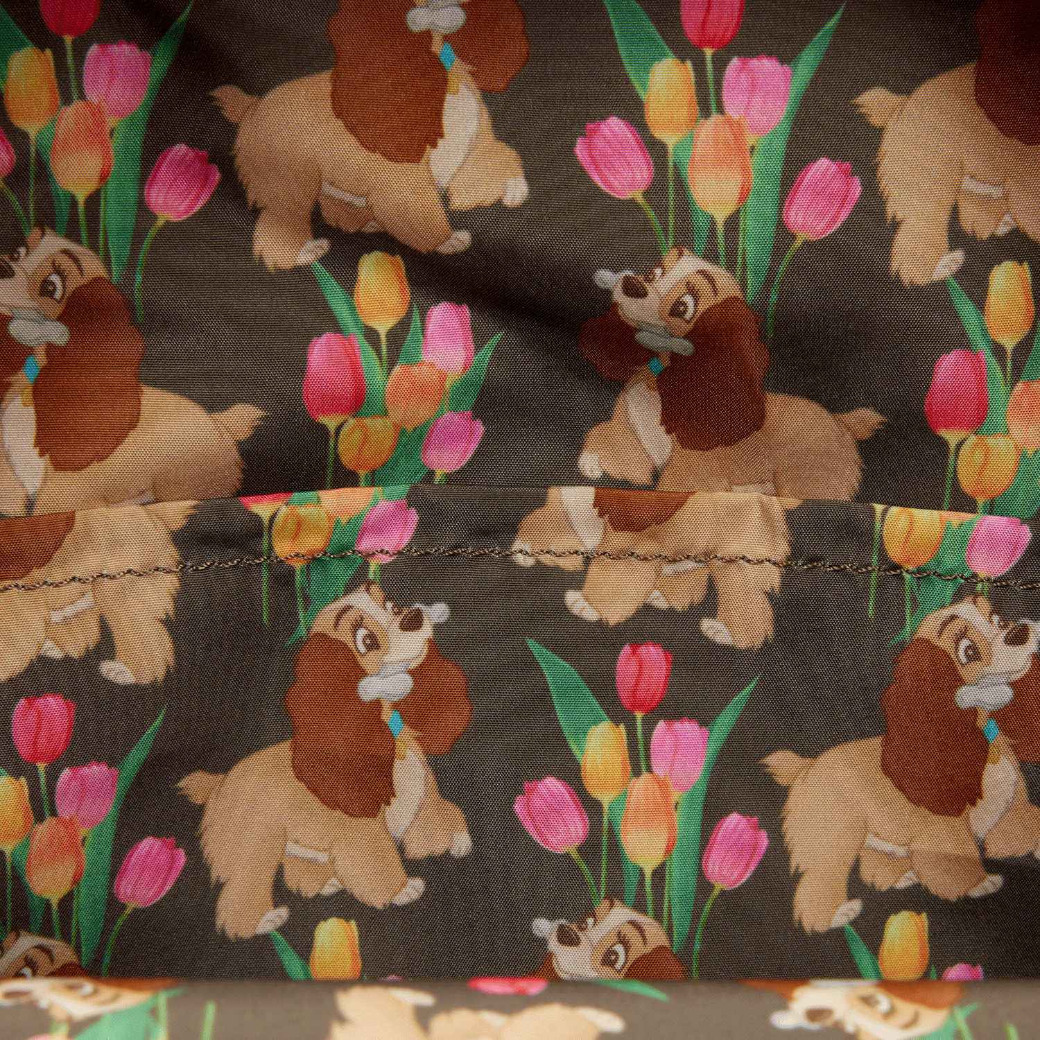 This mini backpack features Lady from Disney’s Lady and the Tramp. She appears on the front pocket with a bone in her mouth. She walks through a field of tulips. On the back, you’ll find her doghouse, which says “Lady” on it. Embroidered details make the imagery on this bag pop!